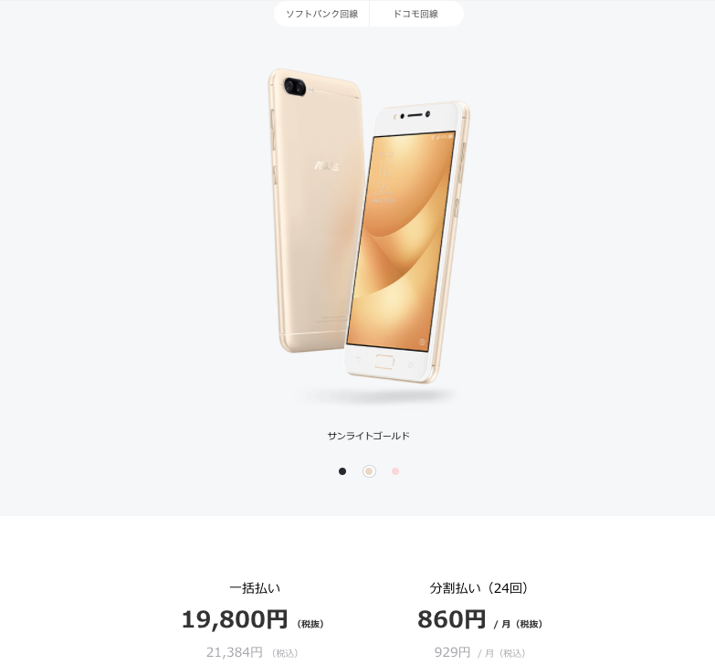 | ZenFone 4 Max | 19,800円 | 860円 / 月 | 1,300万画素 | 800万画素 | 5.2インチ | 32GB |